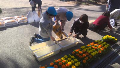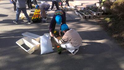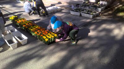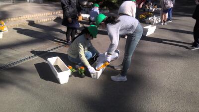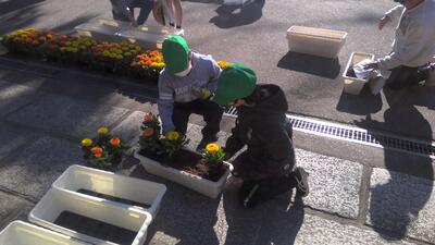 本日の6時間目は委員会活動でしたが、環境委員会では、コメリの方々にお花を持ってきていただき、その花をプランターに植える作業を行いました。オレンジ色と黄色のきれいなキンセンカを、2人一組になって協力して植えました。20ものプランターに植えられた花のお蔭で、玄関が華やかになりました。寄贈いただいた花を大切に育てていきたいと思います。