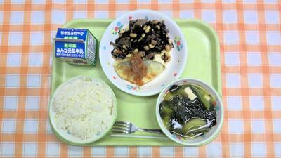 【今日の献立】牛乳、ごはん、あじの南蛮漬け、大豆の磯煮、小松菜と豆腐のみそ汁