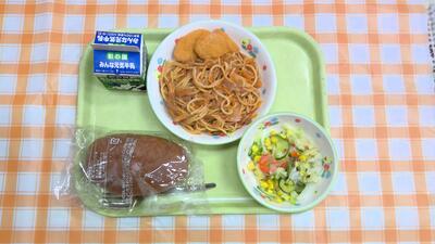 【今日の献立】牛乳、黒パン、ツナとフレッシュトマトのスパゲッティ、チキンナゲット、イタリアンサラダ