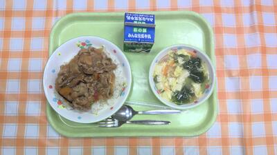 【今日の献立】牛乳、プルコギトッパプ、チンゲン菜とあさりの卵スープ