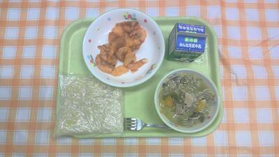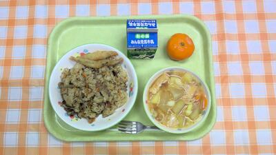 【今日の献立】牛乳、じゅうし(沖縄県の郷土料理)、きびなごフライ、とうがん汁、冷凍みかん