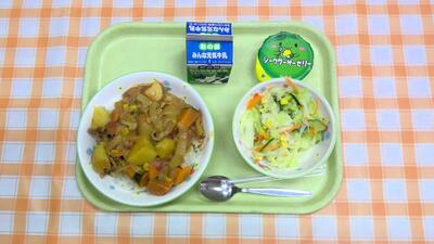 【今日の献立】牛乳、夏野菜カレー、コールスローサラダ、シークワーサーゼリー