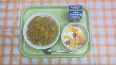 【今日の献立】牛乳、カレーライス、フルーツ杏仁