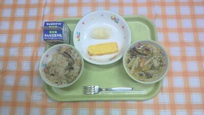 【今日の献立】牛乳、かやくごはん(大阪府の郷土料理)、だし巻き卵、ばち汁(兵庫県の郷土料理)、梨