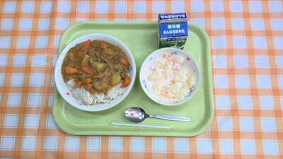 【今日の献立】牛乳、カレーライス、フルーツヨーグルト