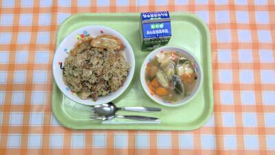 【今日の献立】牛乳、焼肉チャーハン、揚げ餃子、春雨スープ