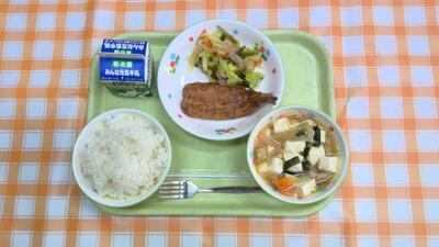 【今日の献立】牛乳、ごはん、いわしのかば焼き、茎わかめの和え物、どさんこ汁(北海道の郷土料理)