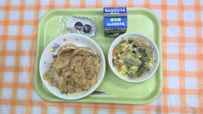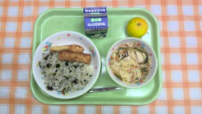 【今日の献立】牛乳、わかめ菜ごはん、いかのかりん揚げ、かきたま汁、みかん