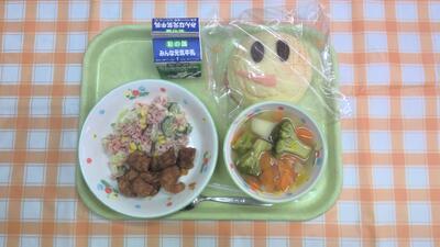 【市民の日記念献立】牛乳、鴻巣ひなちゃんパン、豚肉と鴻巣なしのきらめきソース、コスモスサラダ、彩野菜スープ