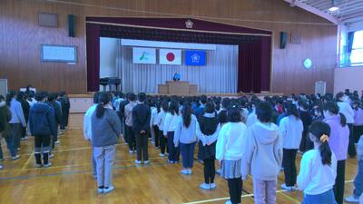 1校時には、第3学期の始業式を行いました。校長式辞では、「次の学年に向けての準備をする3学期にしよう」ということで二つのポイント、1学期・2学期に習ったことを含めて、今の学年の学習をしっかり身につけること、次の学年を意識して生活すること、という話をしました。