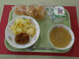 1年生の給食が始まりました。準備の仕方、配膳の仕方など一つ一つ学びました。