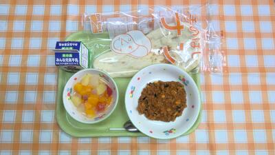 【今日の献立】牛乳、ナン、キーマカレー、フルーツミックス