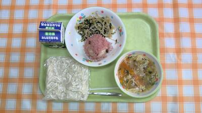 【今日の献立】牛乳、豚バラはくさいの卵あんかけうどん、ニラともやしのおひたし、いがまんじゅう(鴻巣市の郷土料理)