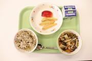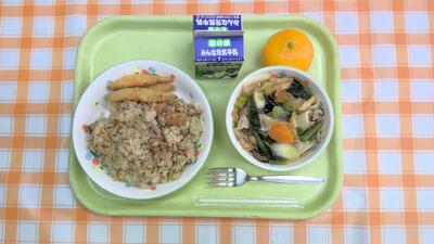 【今日の献立】牛乳、ちゃくし菜ごはん、わかさぎフライ、煮ぼうとう(深谷市の郷土料理)、みかん