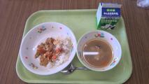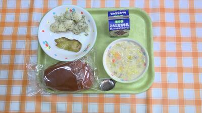 【今日の献立】牛乳、黒パン、赤魚のバジルソース焼き、粉ふきいも、白菜のクリームスープ