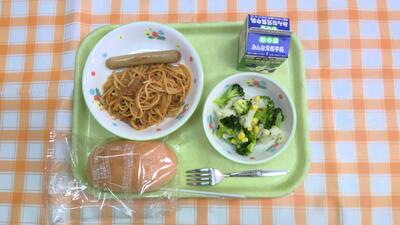 【今日の献立】牛乳、コッペパンスライス、スパゲッティボロネーゼ、フランクフルト、フラワーサラダ