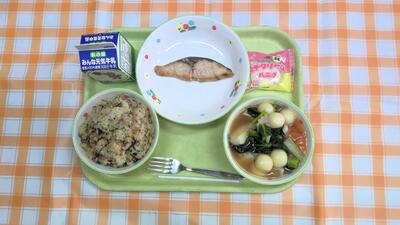 【今日の献立】牛乳、しゃくし菜ごはん、ぶりの照り焼き、雑煮、もちクリームバニラ