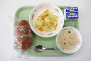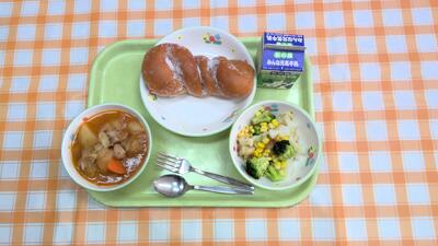 【今日の献立】牛乳、シュガー揚げパン、ボルシチ、フラワーサラダ