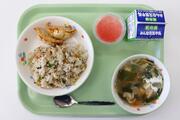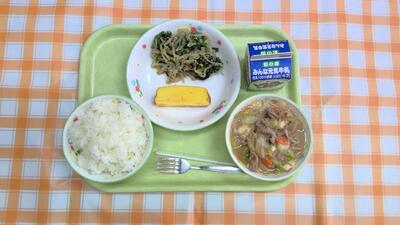 【今日の献立】牛乳、ごはん、すき焼き風煮、厚焼き卵、ほうれん草ともやしのごま和え