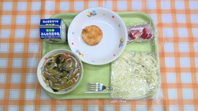 【今日の献立】牛乳、コーンみそラーメン、じゃがチー揚げ、いちご