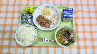 【今日の献立】牛乳、手巻き寿司(酢飯、手巻きのり、ツナマヨネーズ、焼肉、刻みたくあん)、すまし汁、福豆