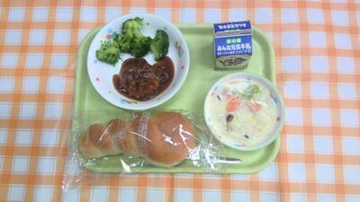 【今日の献立】牛乳、ツイストパン、手作りハンバーグのケチャップソースかけ、ボイルブロッコリー、白菜のシチュー