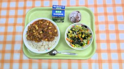 【今日の献立】牛乳、コスタリカライス、ほうれん草サラダ、手作りチョコレートケーキ