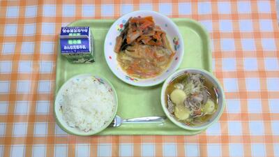 【今日の献立】牛乳、ごはん、鮭のチャンチャン焼き(北海道の郷土料理)、茎わかめの煮物、芋団子汁(北海道の郷土料理)