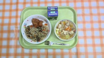 【今日の献立】牛乳、ひじきごはん、ザンギ(北海道の郷土料理)、石狩汁(北海道の郷土料理)
