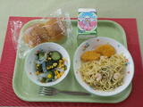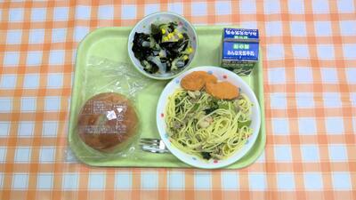 【今日の献立】牛乳、ライスボールパン、春野菜のスパゲティ、チキンナゲット、わかめサラダ