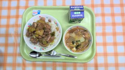 【今日の献立】牛乳、焼き鳥丼、日高こま鍋汁、チーズ