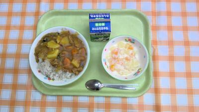 【今日の献立】牛乳、小江戸カレーライス、フルーツヨーグルト