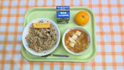【今日の献立】牛乳、さんまごはん、だし巻き卵、あさりのみそ汁、みかん