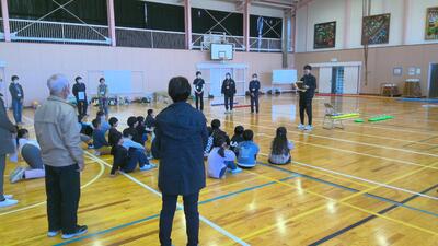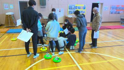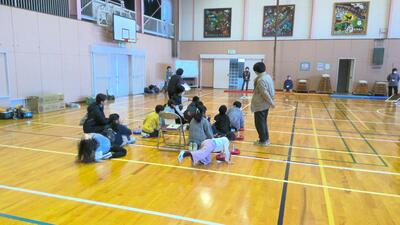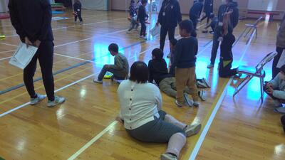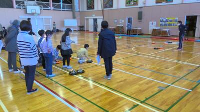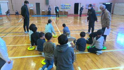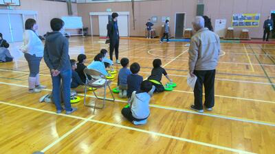 本日の放課後子ども教室は、体育館でカローリングを行いました。カローリングは、氷上で行うカーリングをフロアーでできるように考えられた競技です。フロアーコートで、1チームが6個のジェットローラを、コートの先端にある直径90cmのポイントゾーンに向け、相手チームのプレイヤーとジェットローラを講義に走行してぶつけ合い、得点を競うゲームです。今日は、市役所やスポーツ推進委員の方々からルールを説明してもらってから練習をし、実際に6チームに分かれて3か所でゲームを行いました。練習の時は、ジェットローラの転がり方や方向に戸惑っている面もありましたが、回数を重ねるにつれてみんな上手に的に向かって転がしていました。
